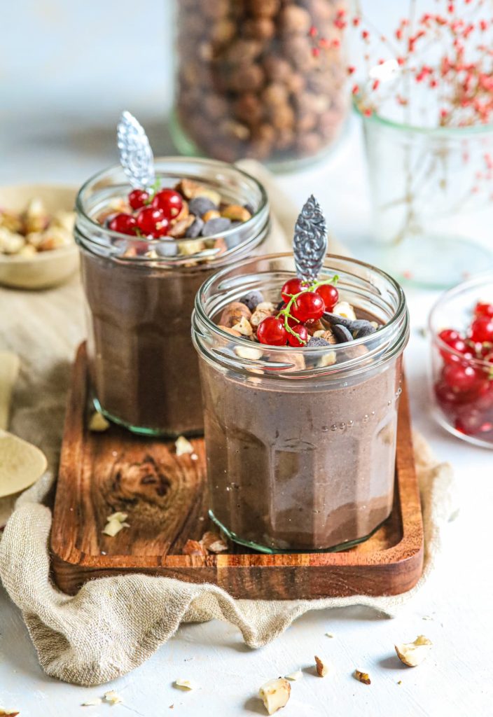 8. Haal de chocolademousse uit de koelkast. Verdeel over 6 glaasjes of kommetjes.