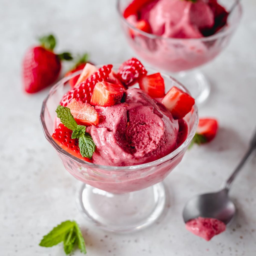 3. Haal uit de vriezer en schep het ijs in serveerbekers. Versier met verse aardbeien. Serveer onmiddellijk