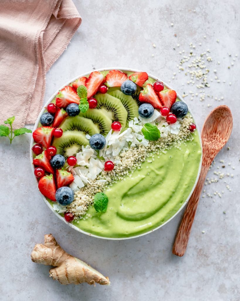 1 groene kiwi, 4 aardbeien, handvol bosbessen en rode aalbessen, 1 el ongezoete kokoschips, 2 tl hennepzaad, verse muntblaadjes