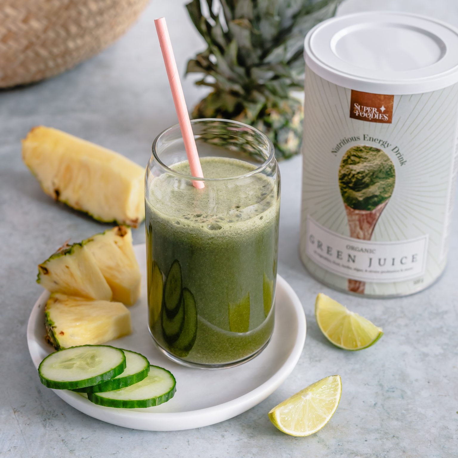 Je lichaam heeft urenlang gevast tijdens de nacht, dus hydrateer het met een groot glas water. Voeg je daar meteen alle voedingsstoffen aan toe die je gedurende de dag nodig hebt, dan ben je de hele dag energieker en scherper. Niet met ups en downs, zoals van koffie, maar langdurige stabiele energie. Dat doe je met een schepje Green Juice van Superfoodies in je glas water. Green Juice is een hoge bron van vitamine B12 (de ‘energie vitamine’). Zo ben je scherp gedurende de dag, zonder dat je dat bakkie koffie nodig hebt. Green Juice bevat veel voedingsstoffen – dus je hebt geen multivitamine meer nodig (zoals kalium, ijzer, magnesium, calcium). Ook is het een volwaardig probiotica supplement voor een gezonde darmflora.