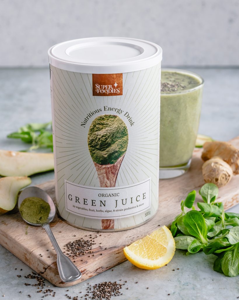 Green Juice bevat een groot deel van je dagelijkse behoeften in één drankje, dankzij de unieke biologische mix van 30 groenten, fruit en superfoods. Start je dag vol vertrouwen en gezondheid met een glas Green Juice op een nuchtere maag.