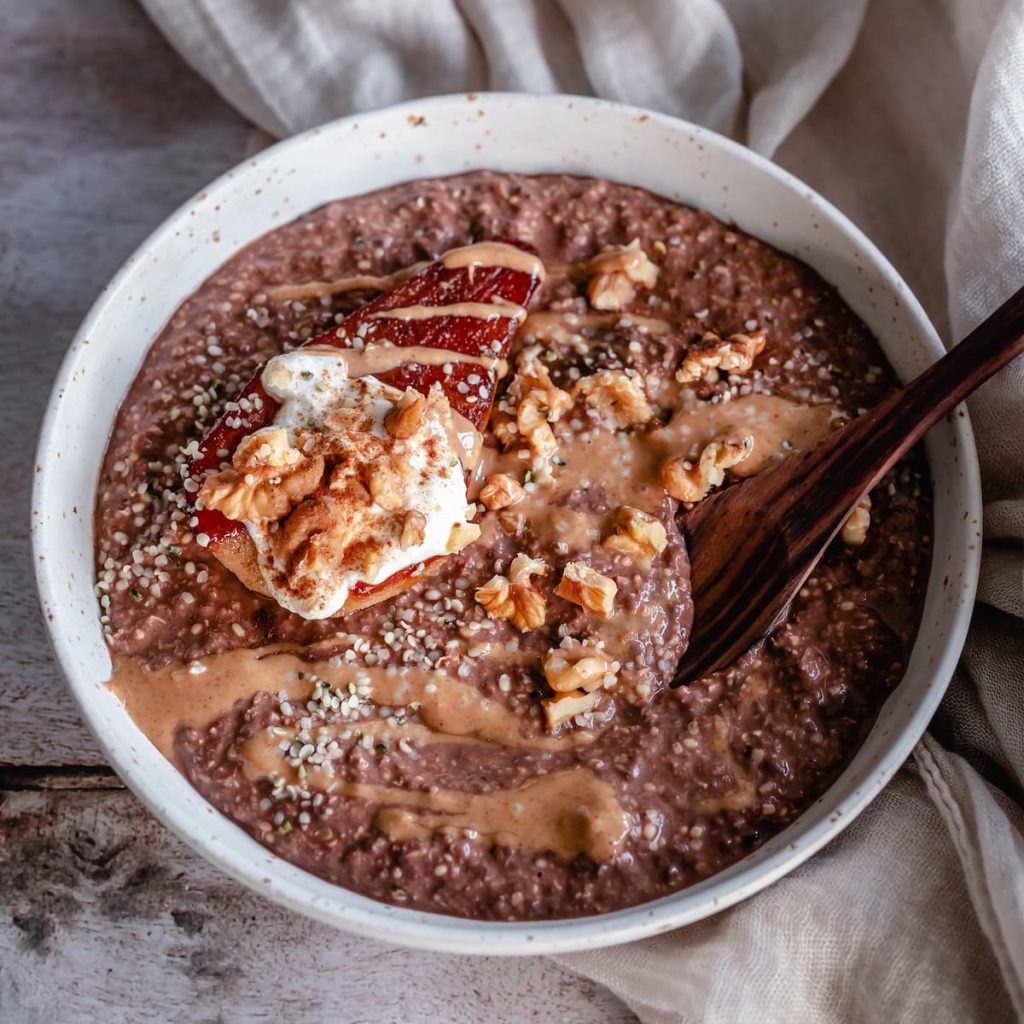 5. Serveer in een kom op de warme havermout, besprenkeld met amandelboter, en bestrooid met hennepzaad en kaneel.