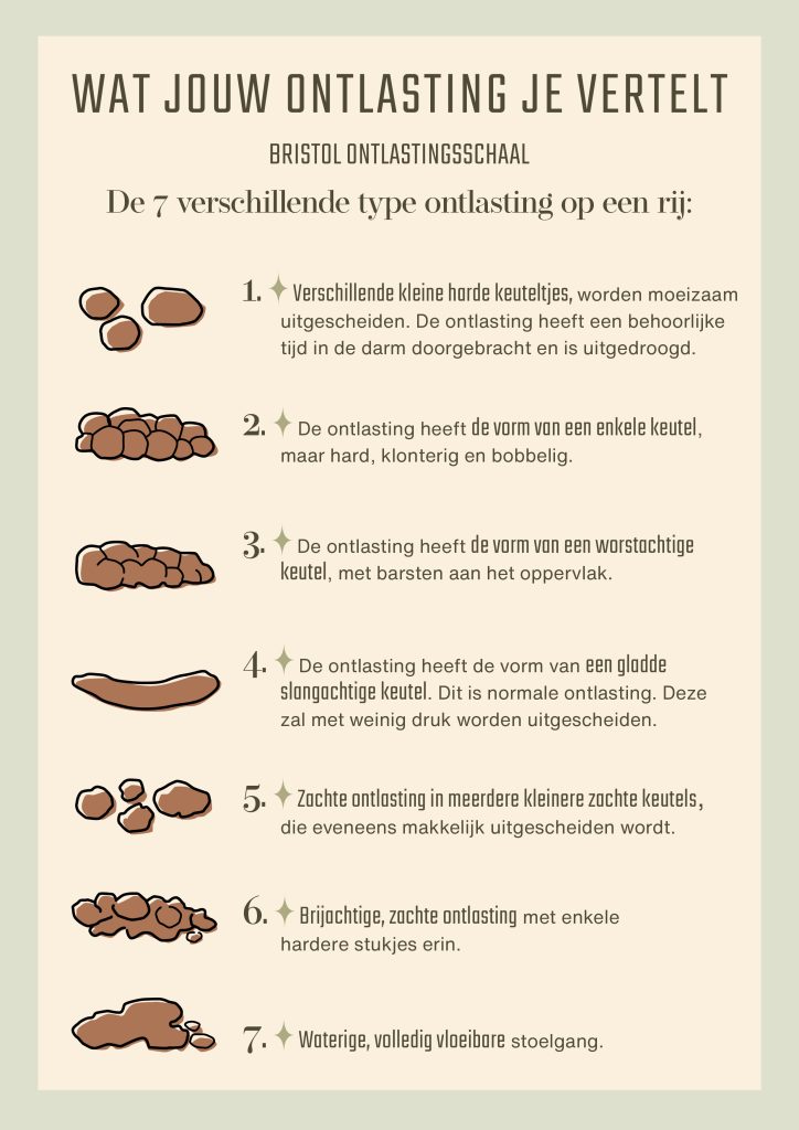 Ideaal zijn type 3 en 4, maar nummer 4 is de absolute winnaar. Dit is de meest gezonde vorm van ontlasting: zacht en glad in de vorm van een worst of slangetje. Bij type 1 en 2 wordt gesproken over constipatie en bij type 6-7 over diarree. Type 1 heeft het langst in de darmen gezeten en deze vorm van ontlasting komt het meest voor bij mensen met een ongezonde levensstijl. Type 7 heeft het kortst in de darmen doorgebracht.