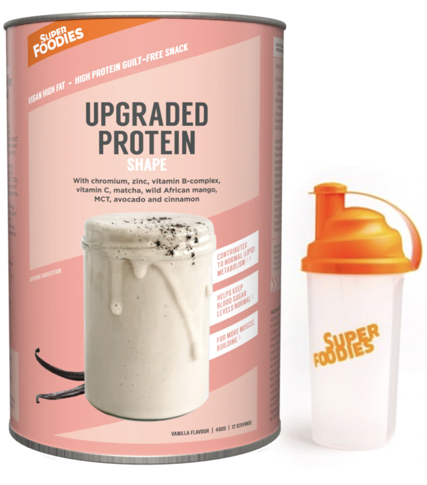 MCT olie (afkomstig uit kokosolie), gefermenteerde bruine rijst eiwit*, avocado olie, kokosmelk*, pompoenpit eiwit*, zonnebloempit eiwit*, Ceylon kaneel*, hennep eiwit*, lijnzaadolie, vanille extract*, CLA (geconjugeerd linolzuur), matcha thee, chroom, zink, wilde Afrikaanse mango extract*, acerola bes vitamine C*, vitamine B 1, 2, 3, 5, 6, 7, 11 & 12, verdikkingsmiddelen (appelpectine, xantaangom), Himalayazout, natuurlijke aroma’s. *Biologisch