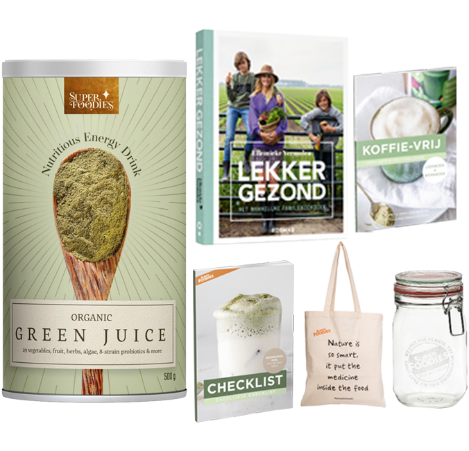 Zo bespaar je geld op supplementen, heb je een volwaardig probiotica supplement voor gezonde darmflora en verbeter je jouw gezondheid met een energiedrank gemaakt van échte groente, superfoods, kruiden, algen en fruit. Biologisch en 100% puur.