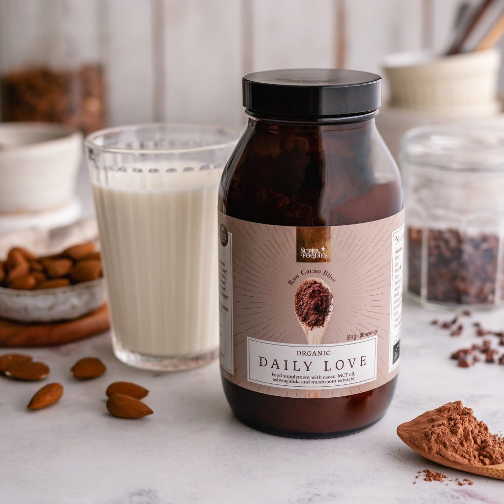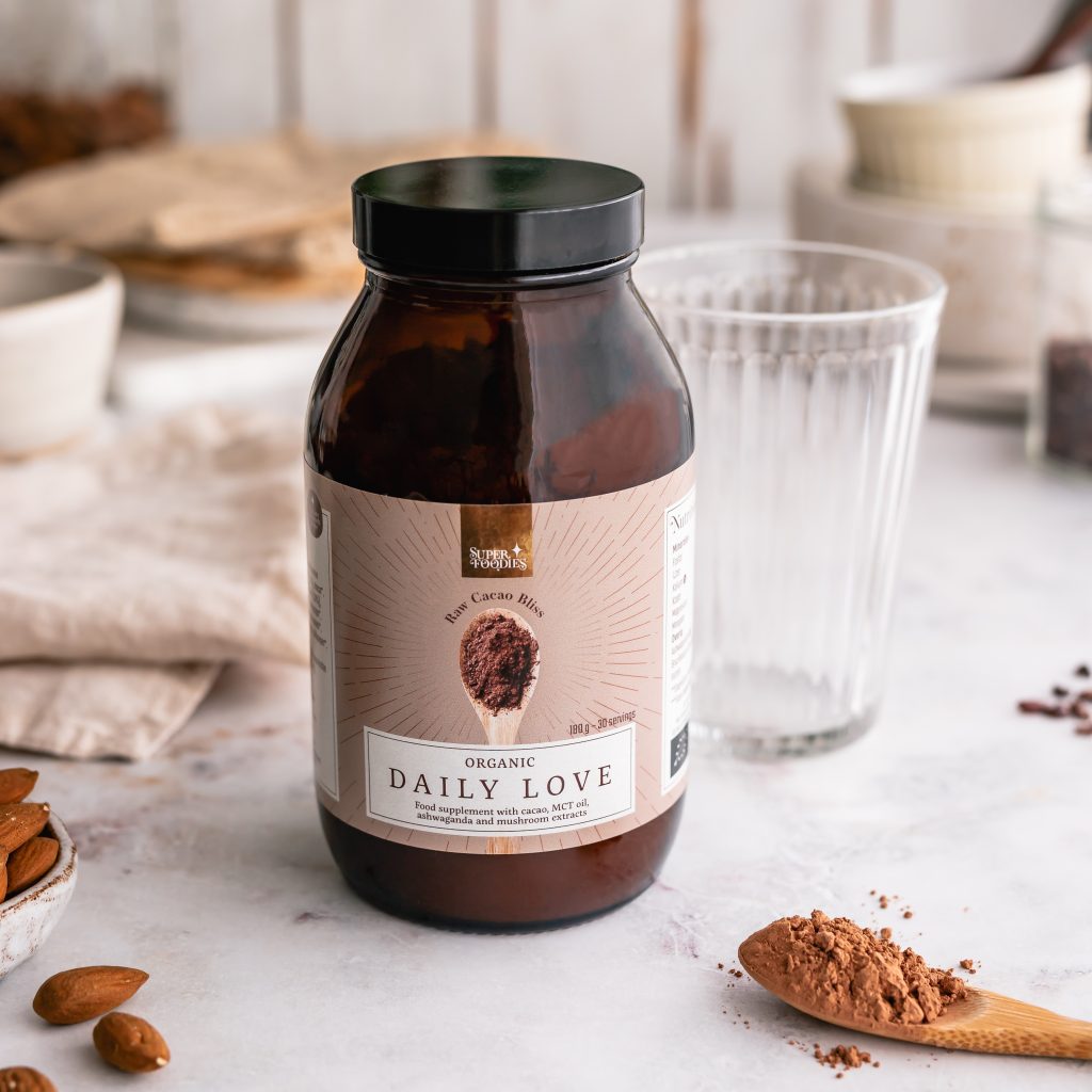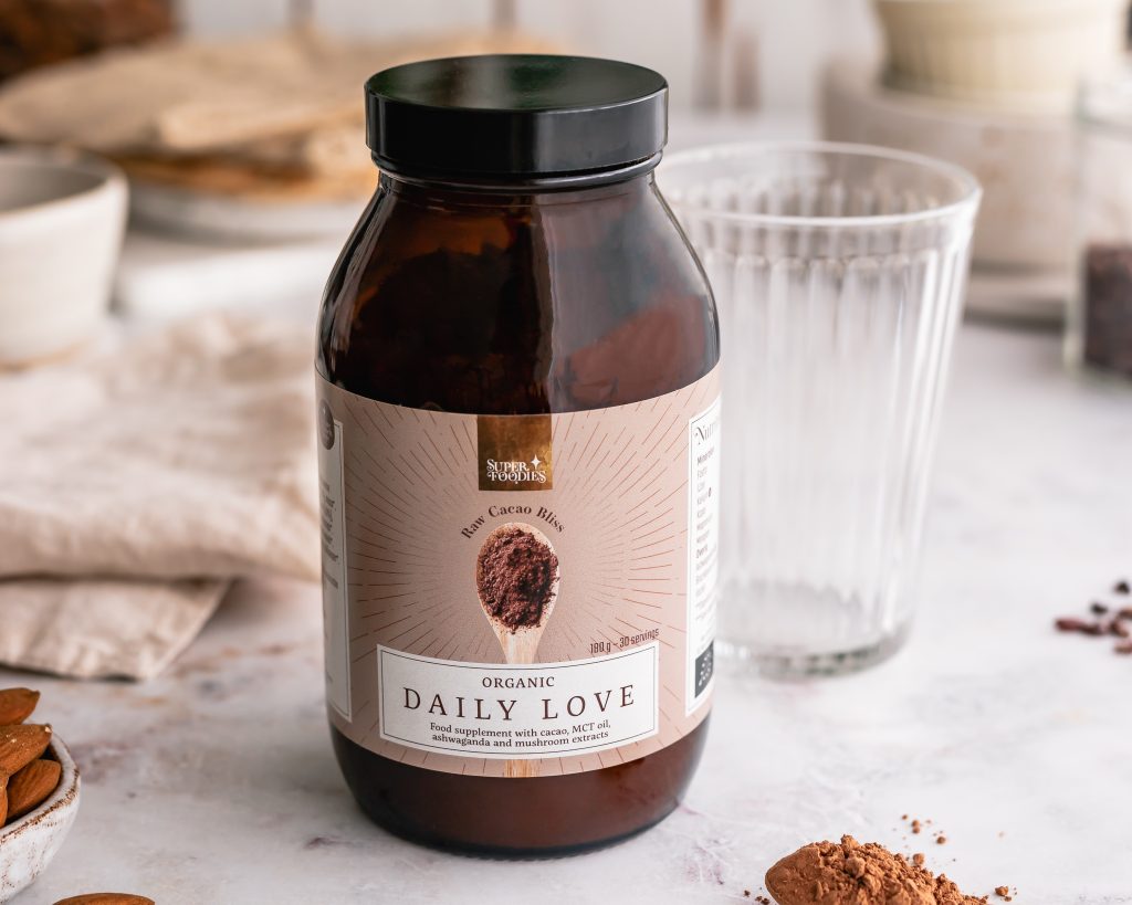 In deze tijden is een dagelijks ‘slow down’ moment geen overbodige luxe. Even genieten van een kopje cacao, zoals sommige culturen cacao al duizenden jaren inzetten. Cacao zit namelijk vol met stoffen waar niet alleen je lichaam, maar ook je gemoed blij van wordt. Cacao heeft bijvoorbeeld een effect  op onze neurotransmitters waardoor we ons vrolijker voelen, minder stress ervaren en meer focus hebben. Wij van Superfoodies hebben hiervoor een speciale ‘ready to mix’ drank ontwikkeld: Daily Love is een poeder met alleen maar natuurlijke ingrediënten zoals rauwe cacao, MCT-olie, ashwaganda en paddenstoelen en uiteraard vrij van gluten, zuivel, soja en kunstmatige toevoegingen. Het bevat goede vetten en weinig calorieën. Je hoeft hier alleen maar heet water of warme plantaardige melk aan toe te voegen, makkelijker kan niet.