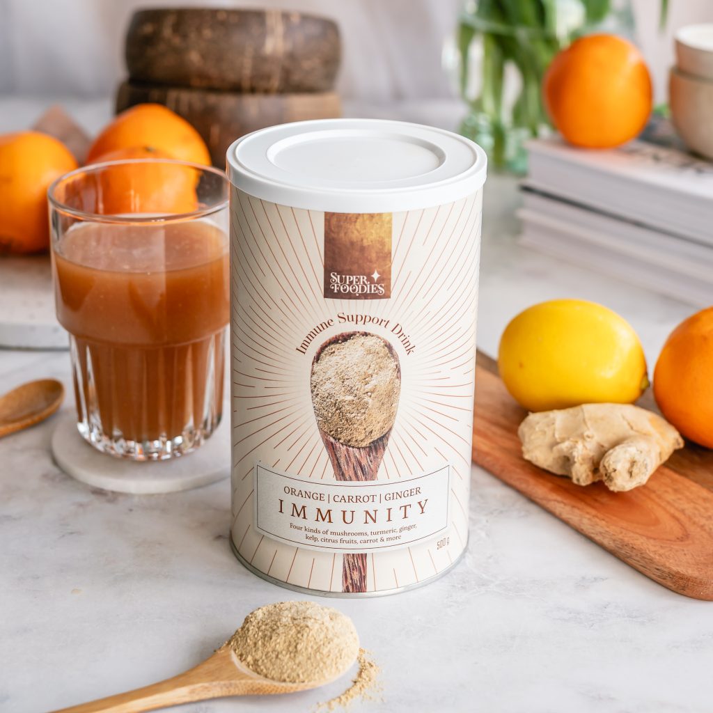 Veel mensen hebben een keukenkastje vol met potjes en poedertjes ter ondersteuning van het immuunsysteem. Dit kost veel tijd, ruimte en geld. Superfoodies vond het hoog tijd om hier een oplossing voor te bedenken. Na twee jaar onderzoek, testen en proeven ontwikkelden zij Immunity Support. Een makkelijke én smakelijke poedermix waarmee je in één keer ashwagandha, acerola en kurkuma binnenkrijgt. Maar ook: kelp, medicinale paddenstoelen, gember, zwarte peper, wortel en zink. Kortom: de ultieme immuunsysteem cocktail.