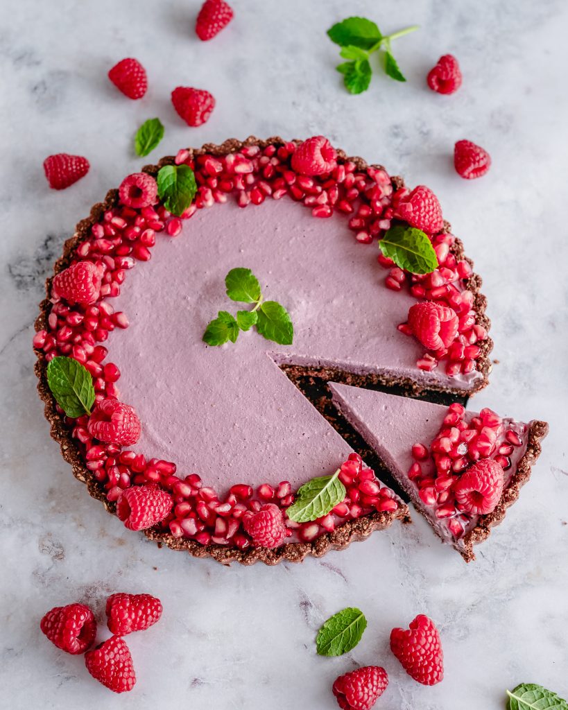 10. Versier de taart door er granaatappelpitjes, frambozen, muntblaadjes en geraspte kokos over te strooien.
